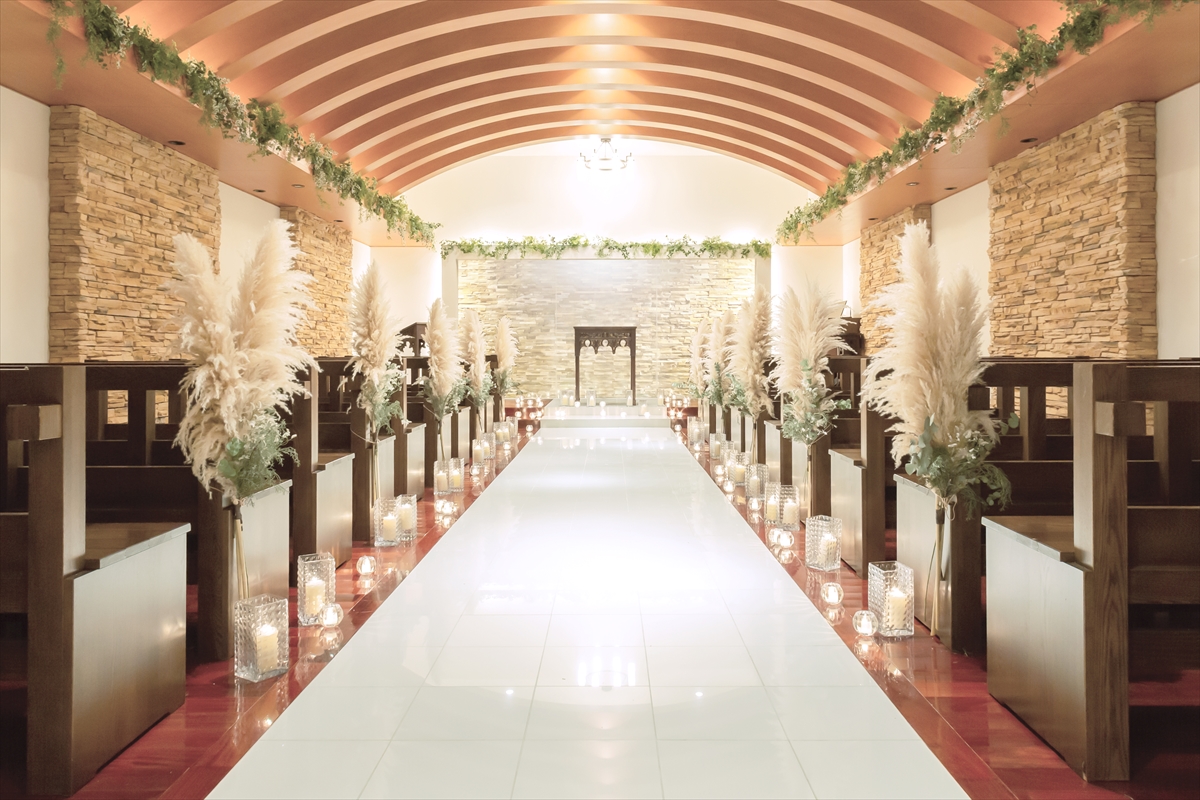 一般的に「装飾NG」の式場が多いチャペルも、同会場では二人らしくコーディネートできるんですよ。