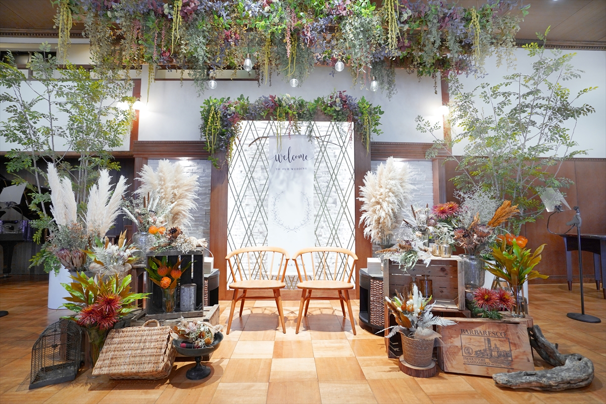 結婚式当日はすべてが二人のプライベート空間なので、エントランスから結婚式のテーマに沿って装飾したり、二人からのメッセージを至るところに散りばめたり…と、二人の世界観で邸宅全体を彩れるのも嬉しいポイント。