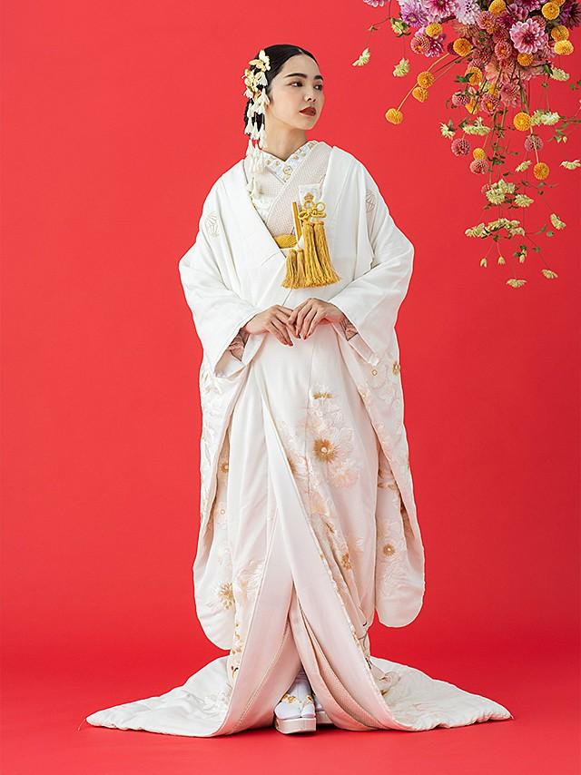 肌馴染みの良いアイボリーの地に、主役級の存在感を放つ「牡丹」の刺繍が贅沢に施された白無垢。