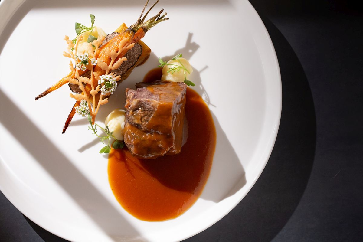 数あるメニューの中でも一番のスペシャリテは、イタリアから持ち帰ったレシピを日本人好みにアレンジした「牛頬肉のビール煮込み」。