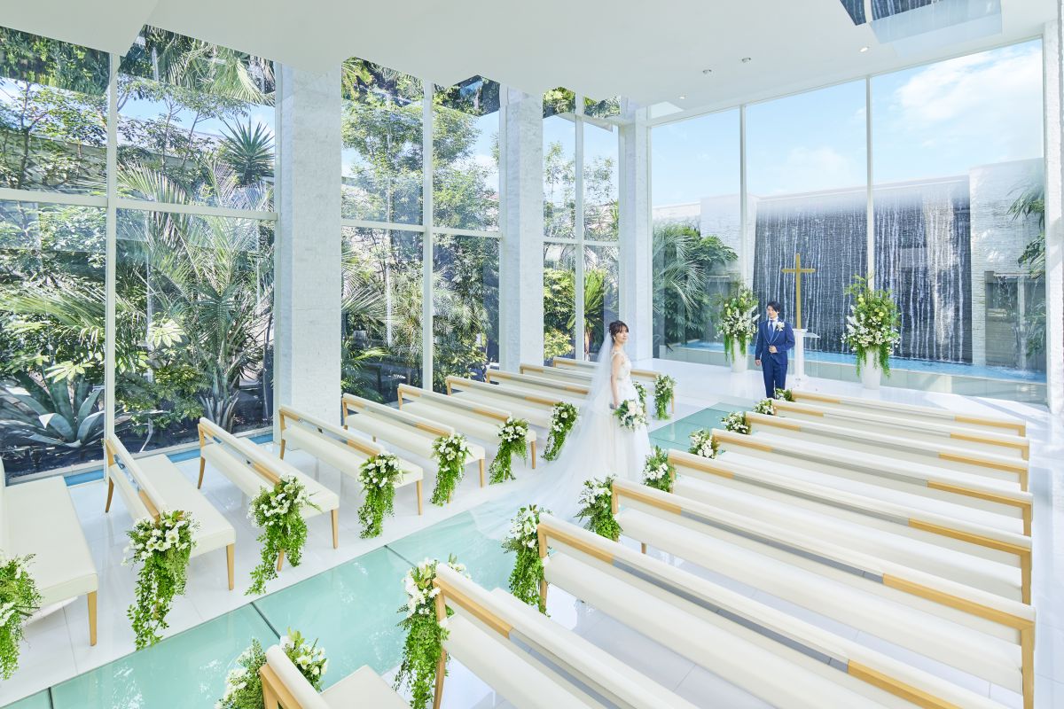 足を踏み入れた瞬間に歓声が上がることも多い…そんな同チャペルは、3面が天井まであるガラスに囲まれた明るい空間。