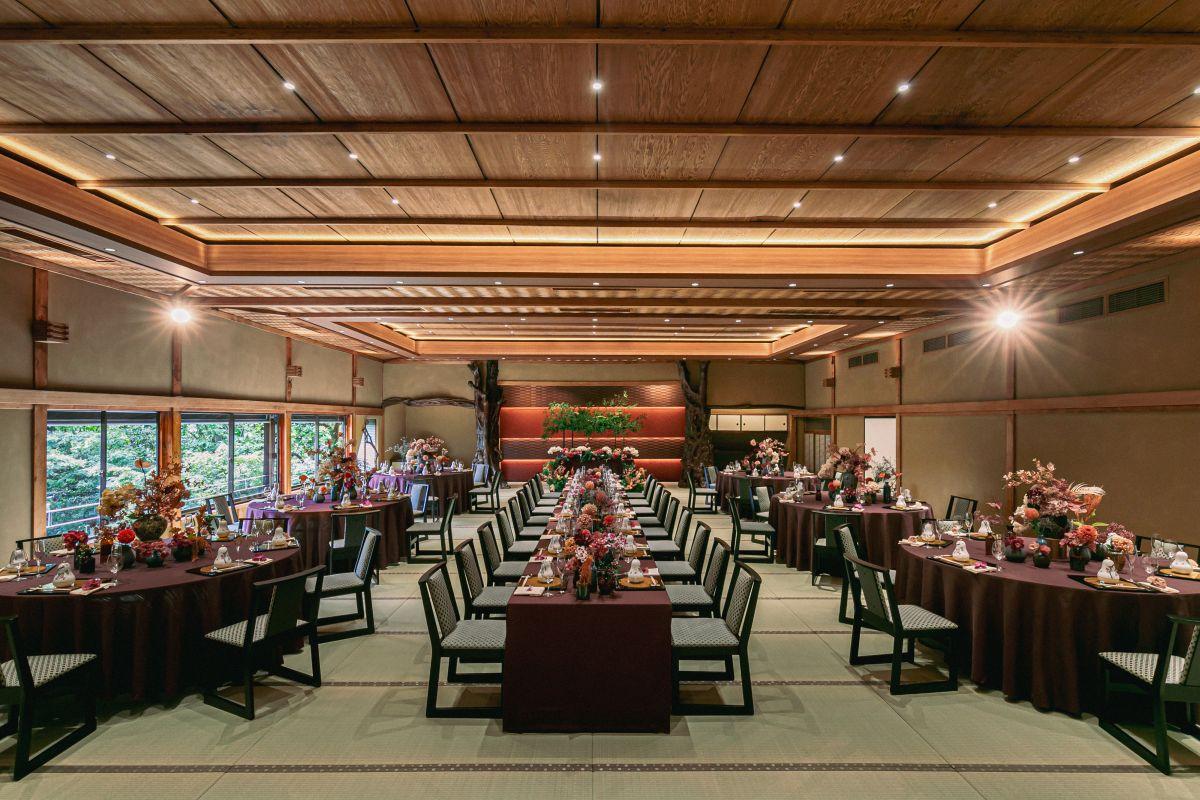 併設テラスの向こうには日本庭園を望める「栴檀(収容人数2〜62名)」や開放感たっぷりのクラシカルな会場「隅田(収容人数2〜34名)」、窓からの美景と総木造りの天井が魅力の「海棠(収容人数2〜34名)」。