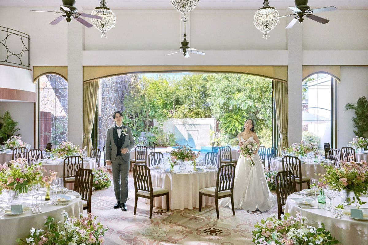 披露宴を執り行う「パーティ会場(収容人数2〜120名)」は、南国リゾートを思わせる開放的なムード。