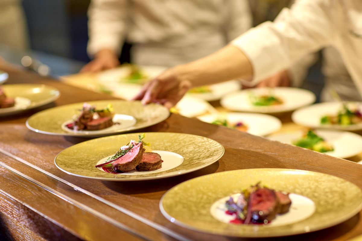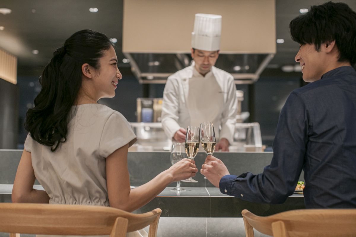 フルオープンにしたメインキッチンが配され、シェフが目の前で料理をつくりあげる臨場感溢れる瞬間が楽しめ、ゲストからも好評です。