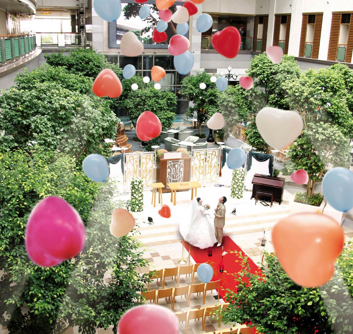 「チャペル/アトリウム(収容人数80名)」では、美しい光のシャワーに包まれたドラマチックな挙式が挙げられると人気。