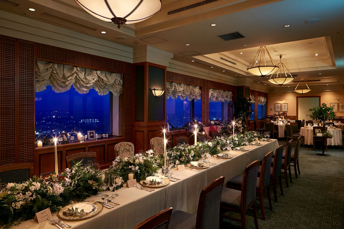 メイン席後方の大きな窓からは庭園の景色を一望でき、四季折々の花々や木々の緑がパーティーにより一層の華やかさを添えてくれます。