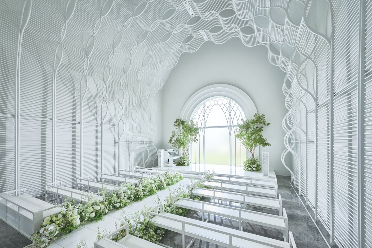 同チャペルのデザインは、新郎新婦を包み込むヴェールをイメージしたもの。