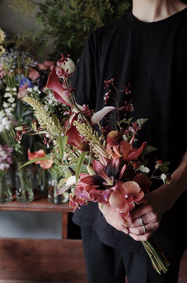 程よくラフなシルエットと動きのある花材使いが、ロケーションの空気感や自然光とマッチし、写真でも柔らかく立体的な印象を演出します。