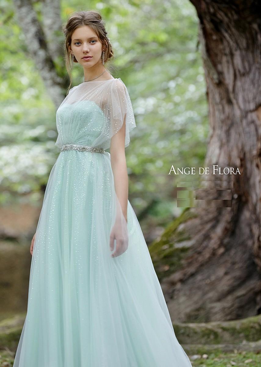 トップスからデコルテにかけて、まるで朝露をモチーフにしたような繊細なレースを贅沢にあしらったミントカラーのスリーブ付きAラインドレス。
