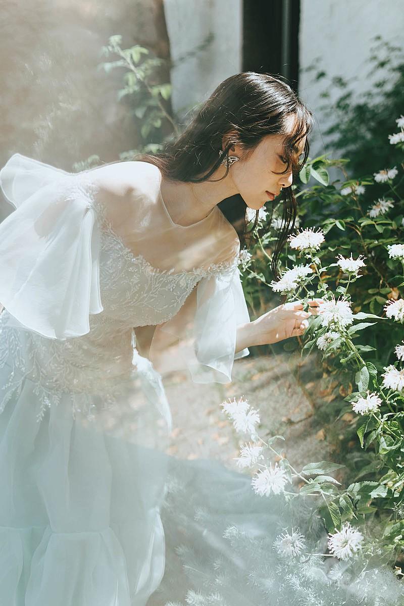 風になびくトレーンのシルエットは、開放的な屋外ロケーションでの撮影でどこから見ても隙のない、絵画のような美しい佇まいを叶えてくれます。