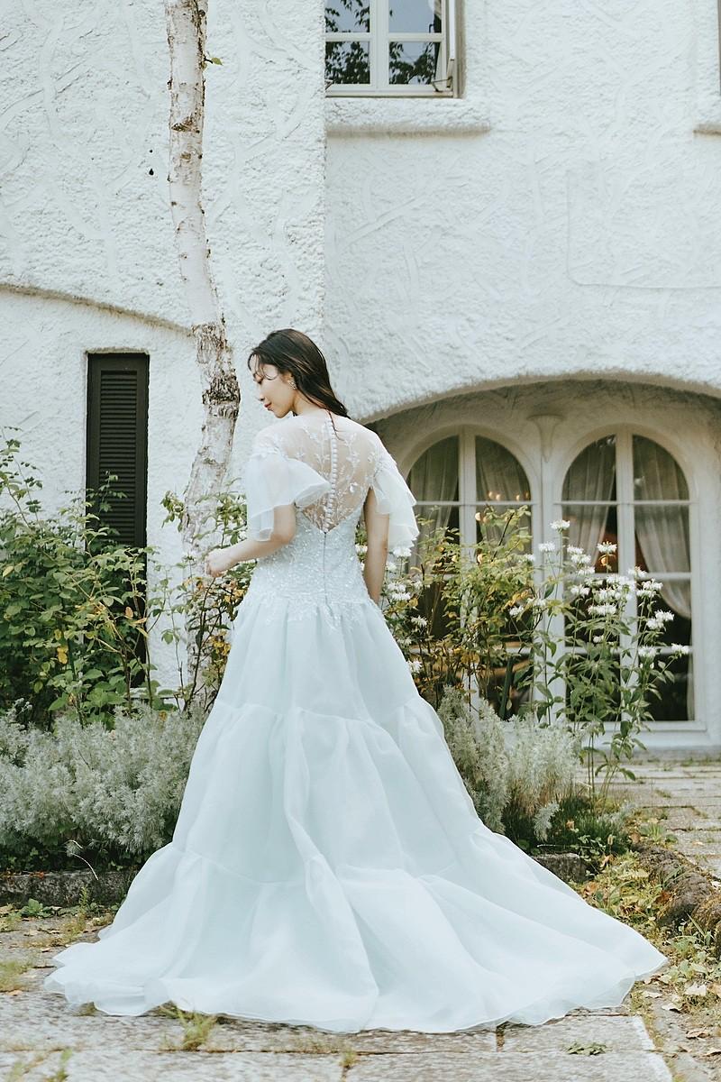 ギャザリングを重ねたボリュームのあるティアードデザインは、風を孕むたびにドラマティックに揺れ、ロケーションフォトならではの躍動感のある美しさを叶えてくれます。