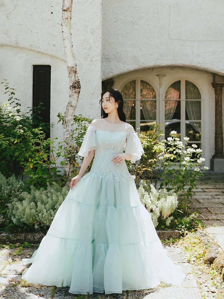 2.ティアードスカート×スリーブデザインのミントカラードレス