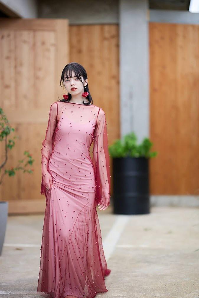 チュールの重なりによる柔らかな色彩を邪魔しないよう、アクセサリーは“肌馴染みの良いマットゴールドのイヤリング”や“華奢なロングピアス”をセレクト。