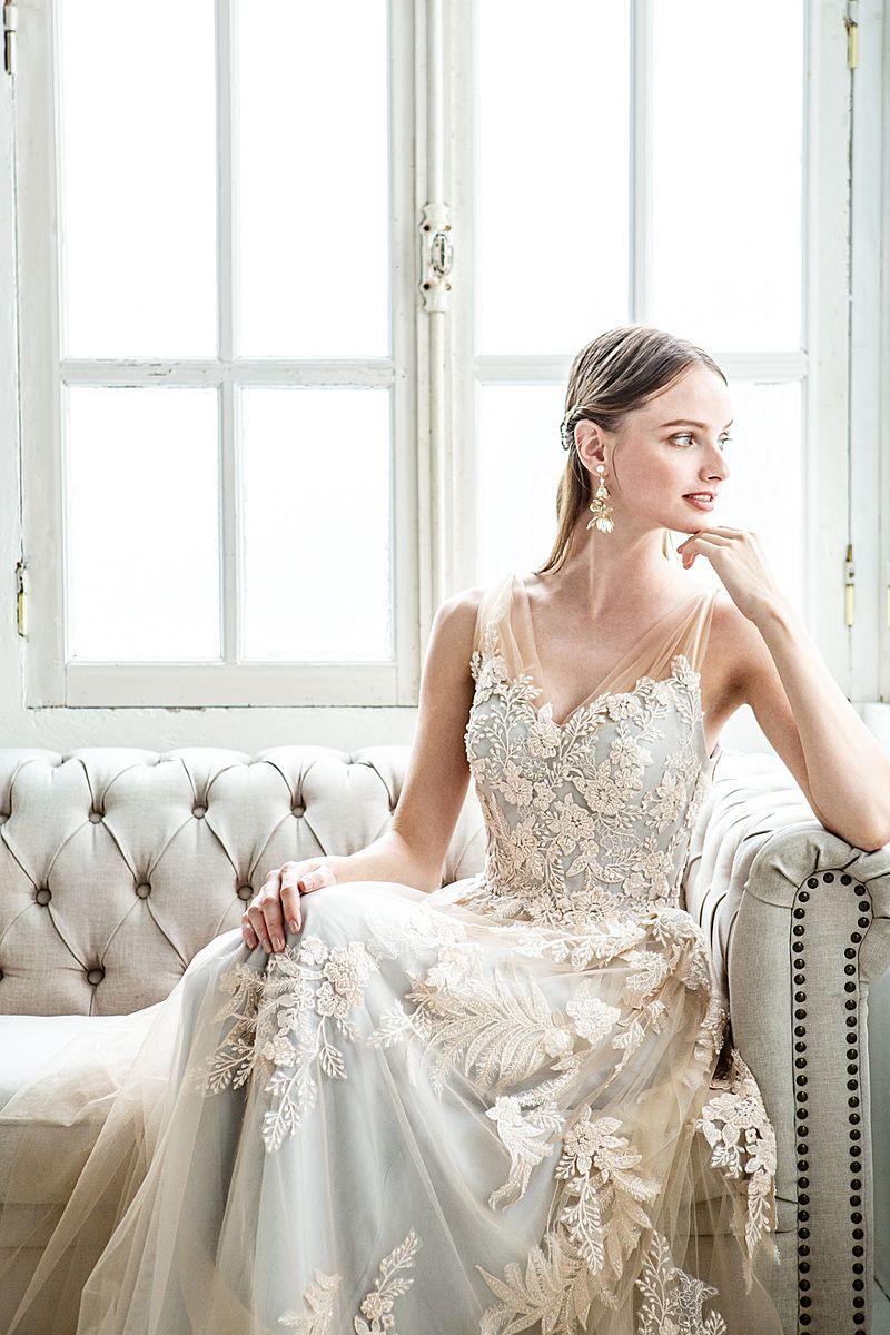 生地を重ねたニュアンス感のあるペールカラーに繊細なビーディングレースをあしらったスレンダーラインドレス。