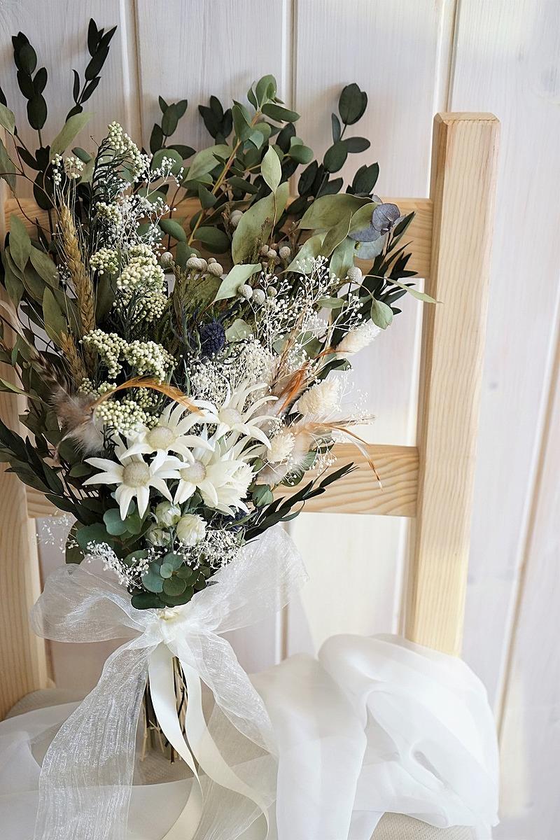 ホワイトを基調にくすみカラーのグリーンやドライ風の花材を束ねたワイルドブーケが、ドレスの繊細なニュアンスカラーや柔らかな素材感とシックに調和。