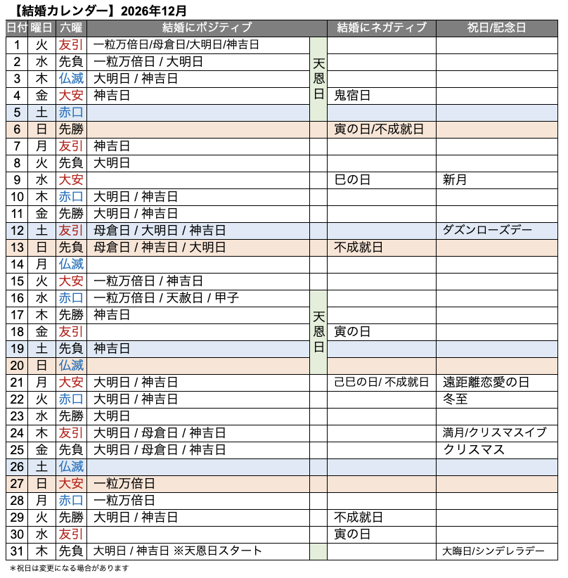 ● 2026年12月の結婚に縁起のいい日・要注意日を完全網羅