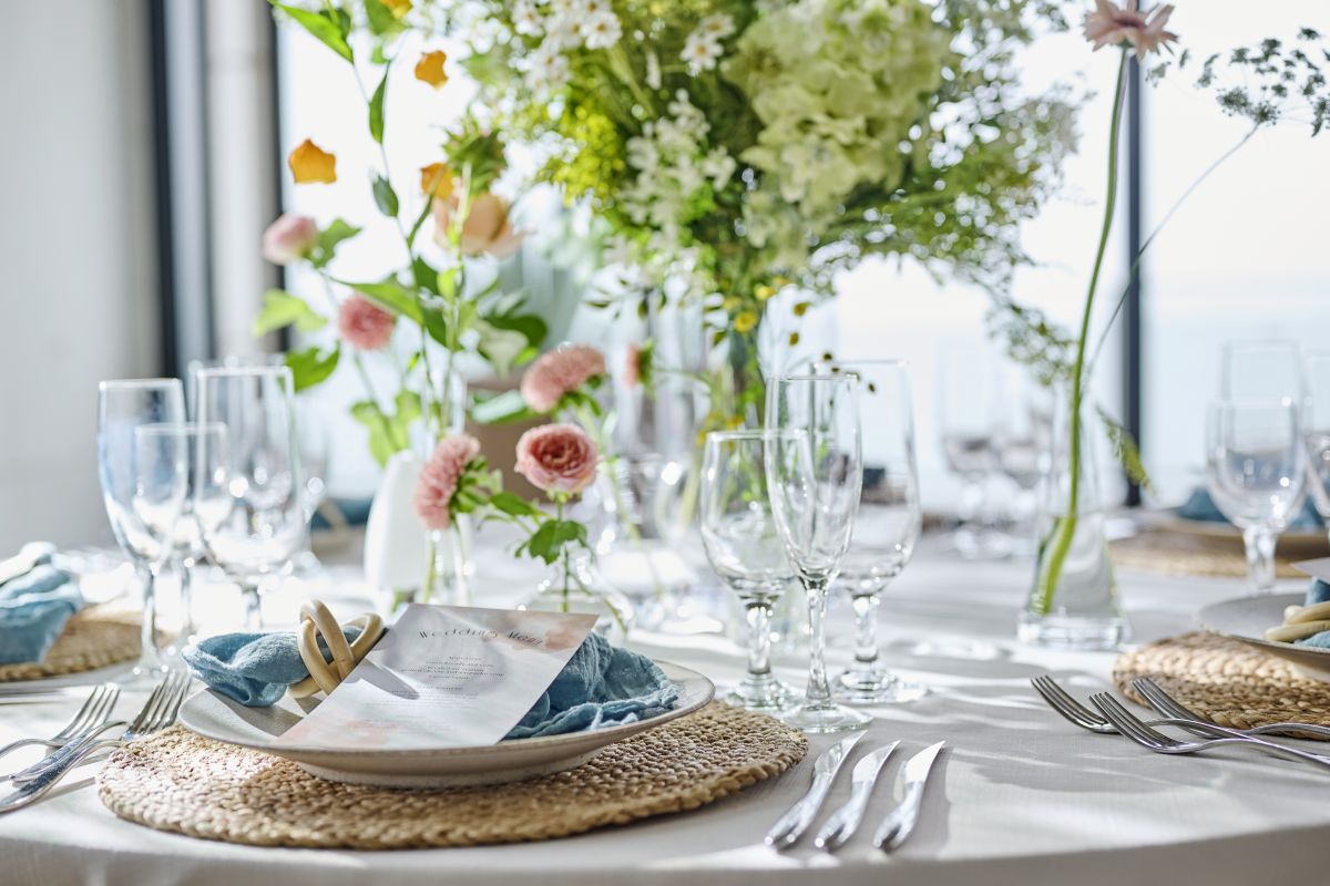オーシャンビューを望むパーティ会場では、青く広がる空と海を背景に、ふたりらしいオリジナリティ溢れる演出が叶います。