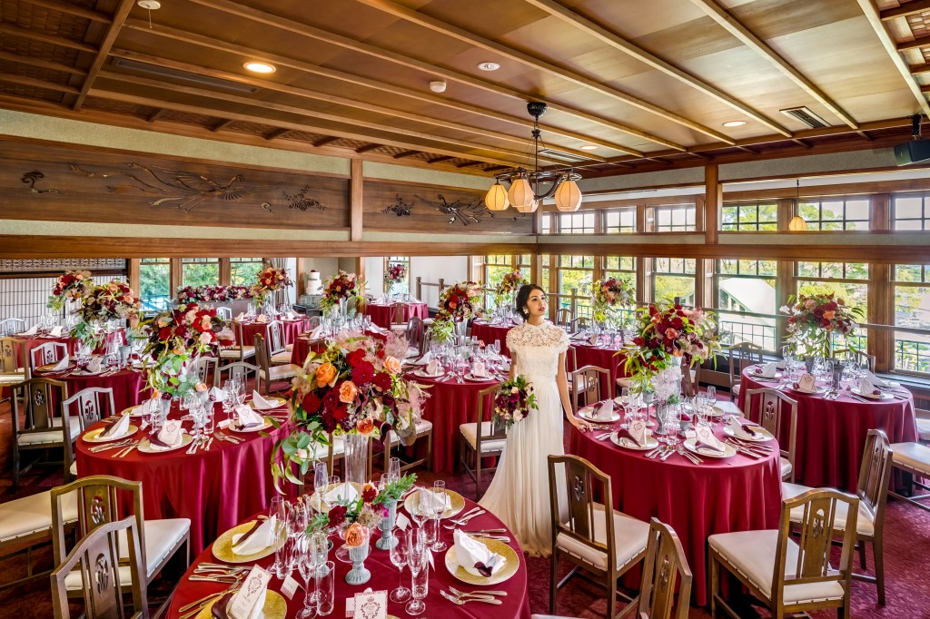 披露宴会場は4つの会場から選べます。「参集殿」は築100余年を有する国の登録有形文化財に指定された建物で、四季折々の日本庭園を臨むことができる華やかな会場。