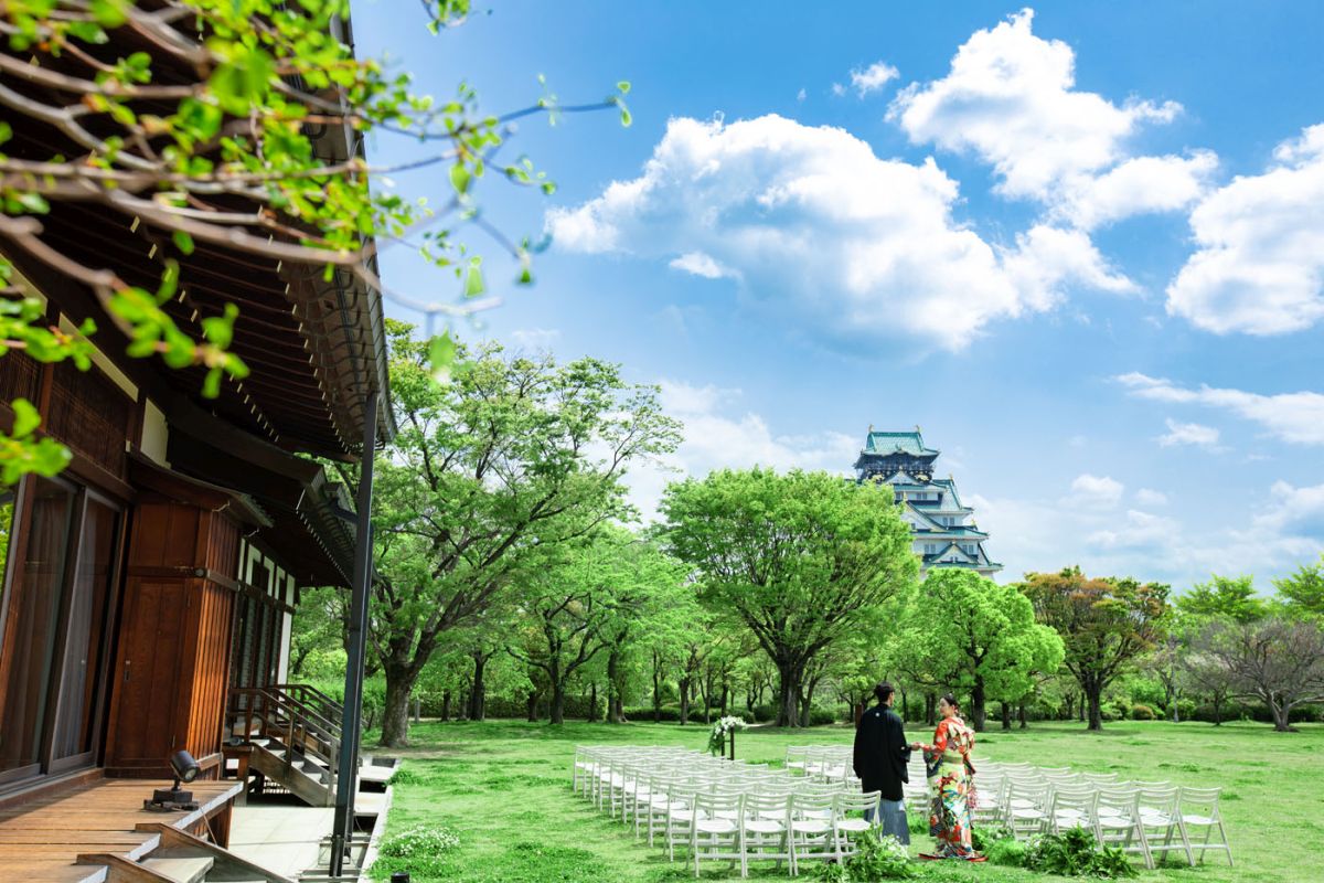 国の特別史跡「大阪城」が一番きれいに見えるという西の丸庭園。四季折々の自然と青空が見渡す限りに広がり、結婚式という特別な舞台を彩ってくれます。