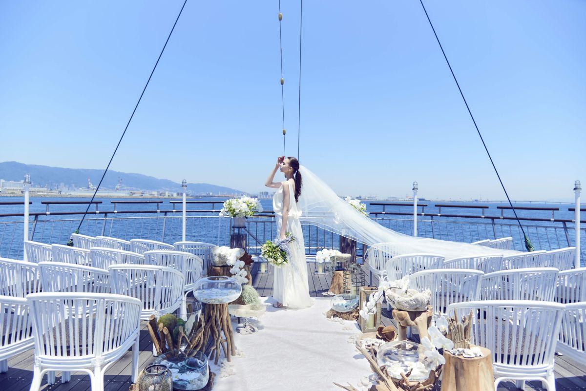 挙式は、メインマストの先の甲板部分に設けられたスペース「アクアマリン(収容人数100名)」と「船上デッキ(収容人数100名)」。