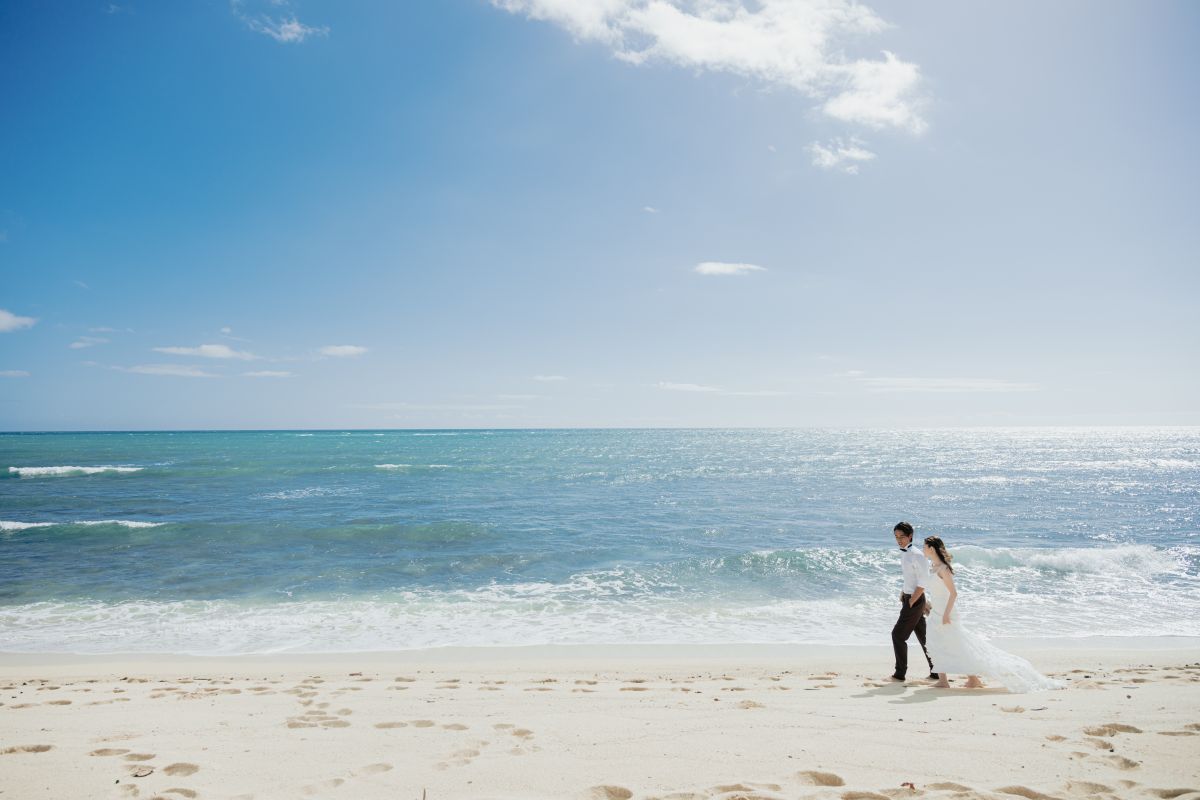 ハワイアンセレモニーの後には、青い海と青い空、白砂が広がるビーチでそのままフォトシューティングを。