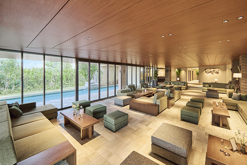 ラウンジはゆったりと寛げる広さで、高級感漂う内装。館内は完全バリアフリー設計で、フィッティングルームや授乳室も完備しています。