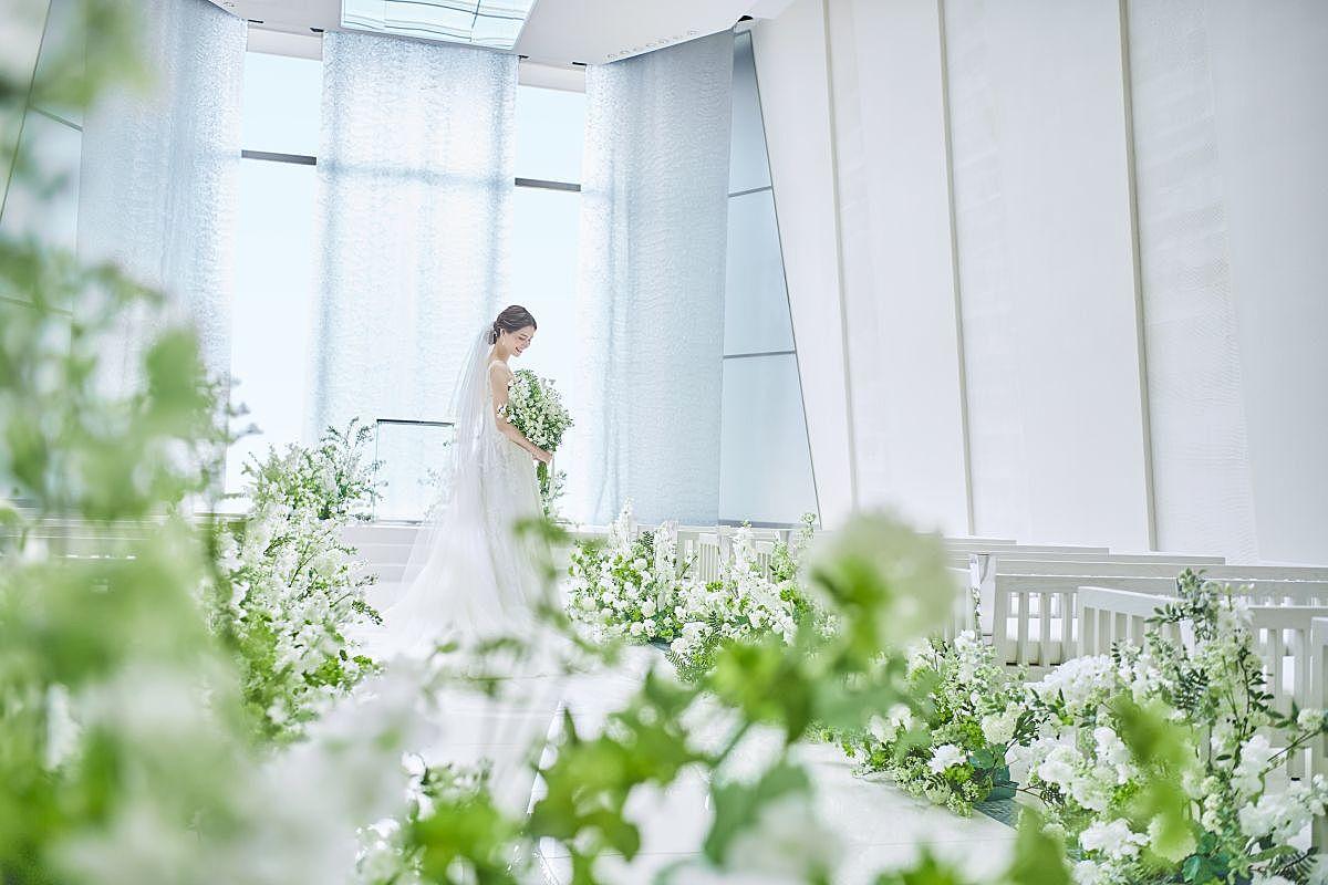 内装に関しては、壁から天井、バージンロード、祭壇に至るまで純白で統一。