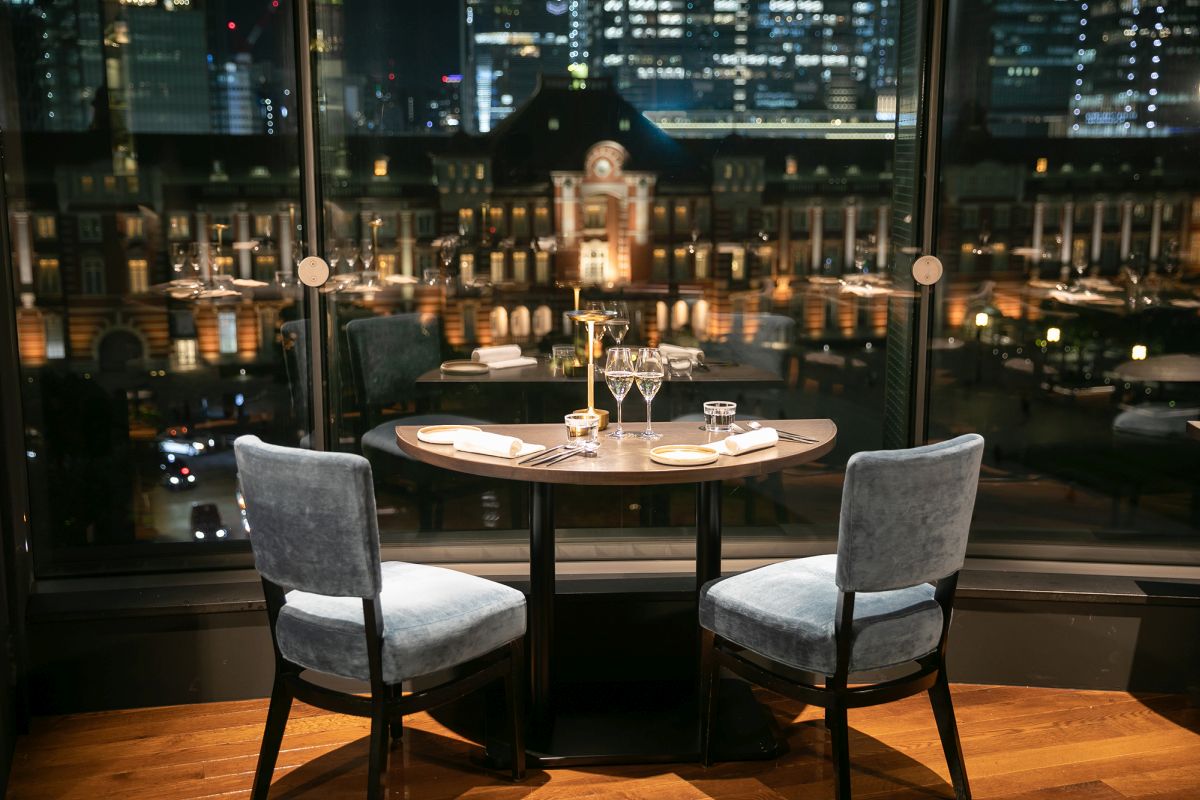 東京駅舎を一望できる空間で、昼はたっぷりと降り注ぐ自然光の中で、夕方から夜にかけては美しくライトアップされた夜景が雰囲気を演出します。
