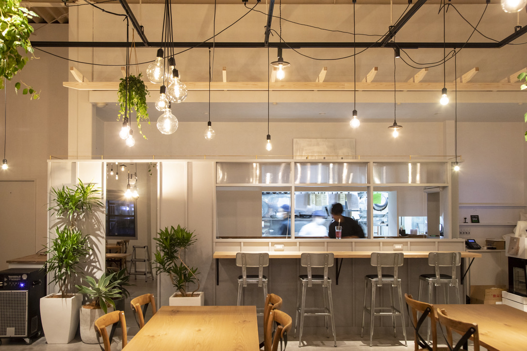 まるで海外レストランのような雰囲気で、壁にはグリーンのウォールアートをデザインし、ムードのあるオープンキッチンを併設。