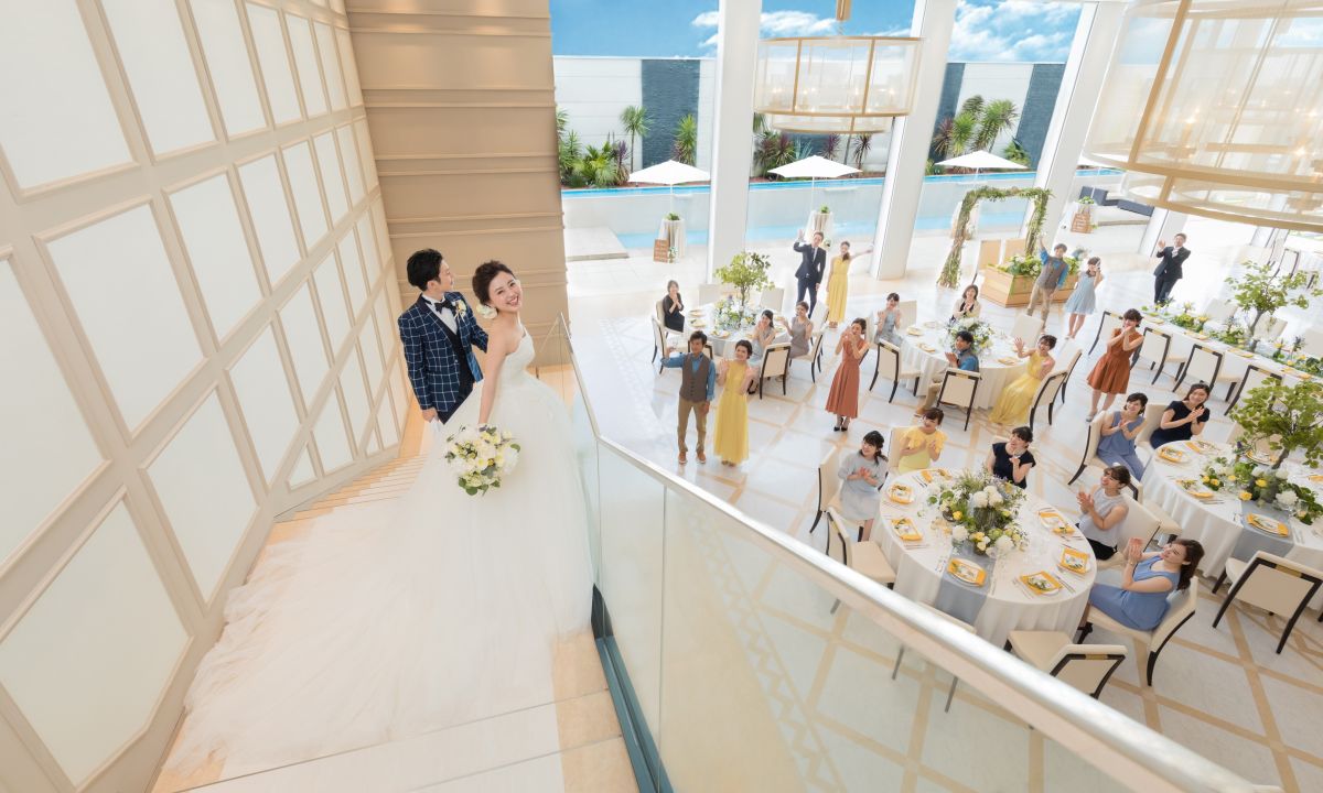 会場内に完備された大階段からの華やかな入場演出や、全長9mの併設したオープンキッチンから料理のもてなしがしっかりできるのもポイントです。