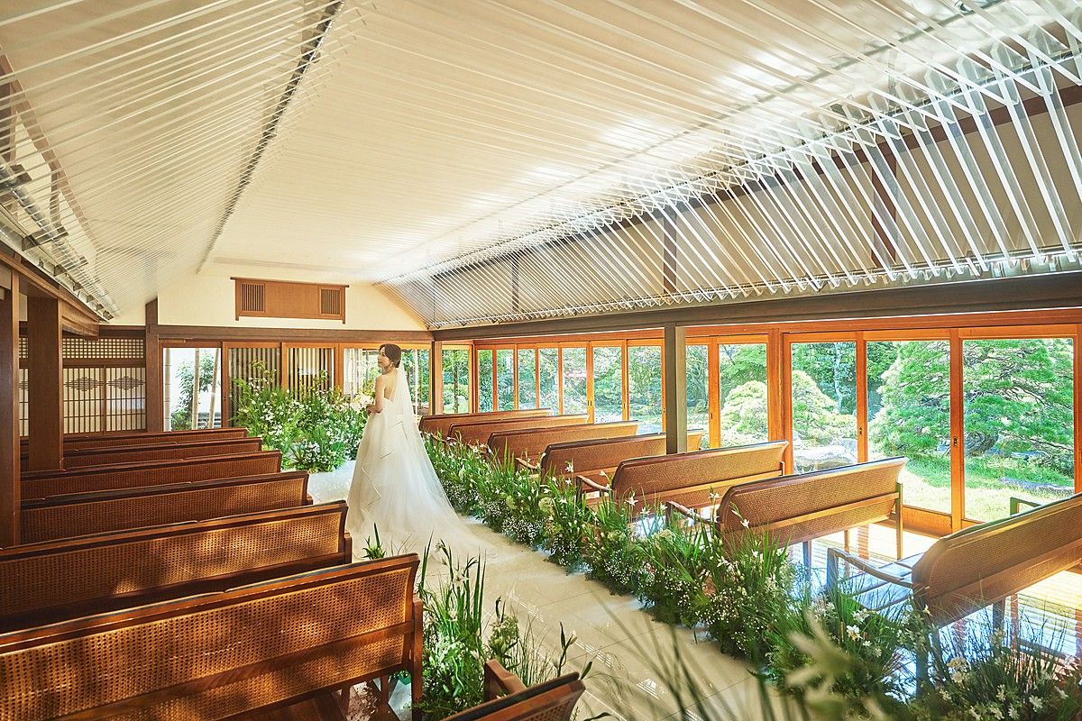 三瀧荘の挙式会場は、日本建築とモダニズムが融合した温かみのあるチャペル。