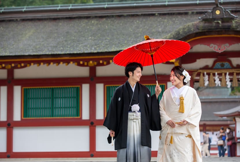 儀式殿での挙式後は、本殿前で結婚の奉告を行い、朱塗りの太鼓橋や花嫁行列など、華やかで美しい光景が広がります。