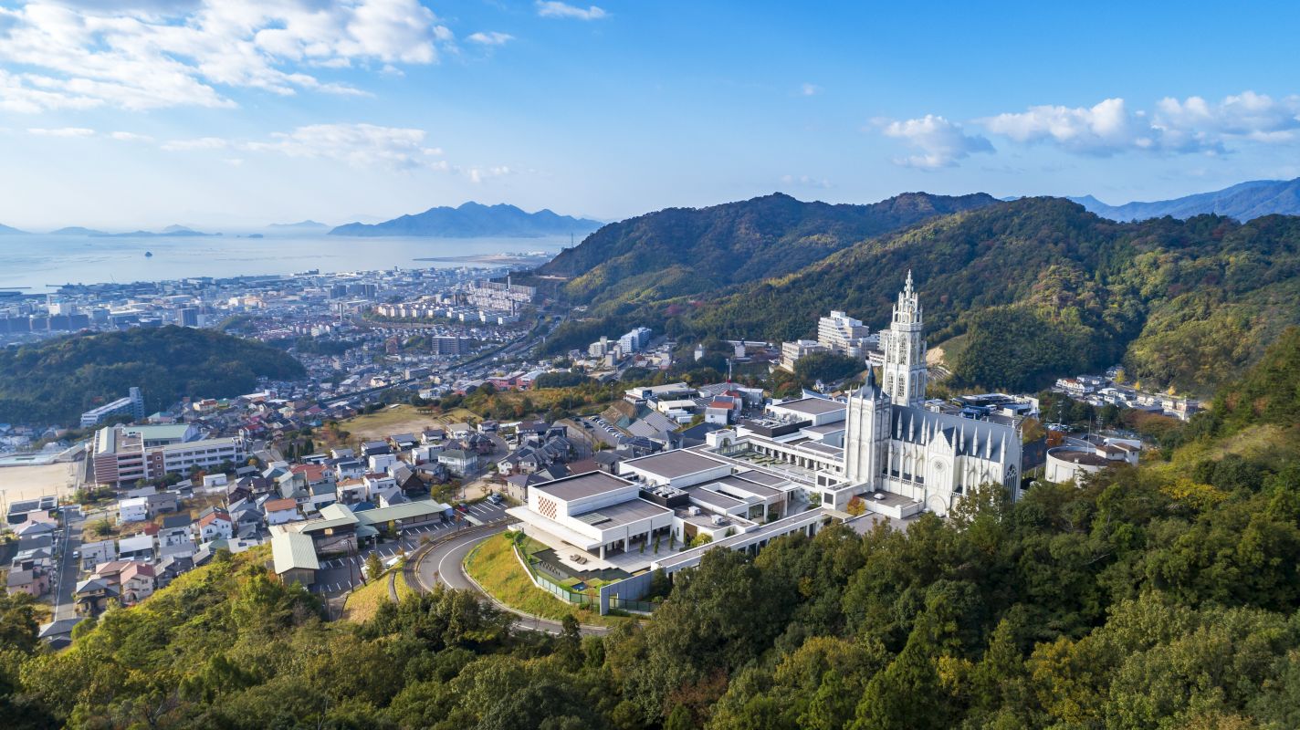 広島市西区古田台の高台に位置する「ノートルダム広島」。瀬戸内海を望む圧倒的な好ロケーションにありながら、JR広島駅からは車で約30分。