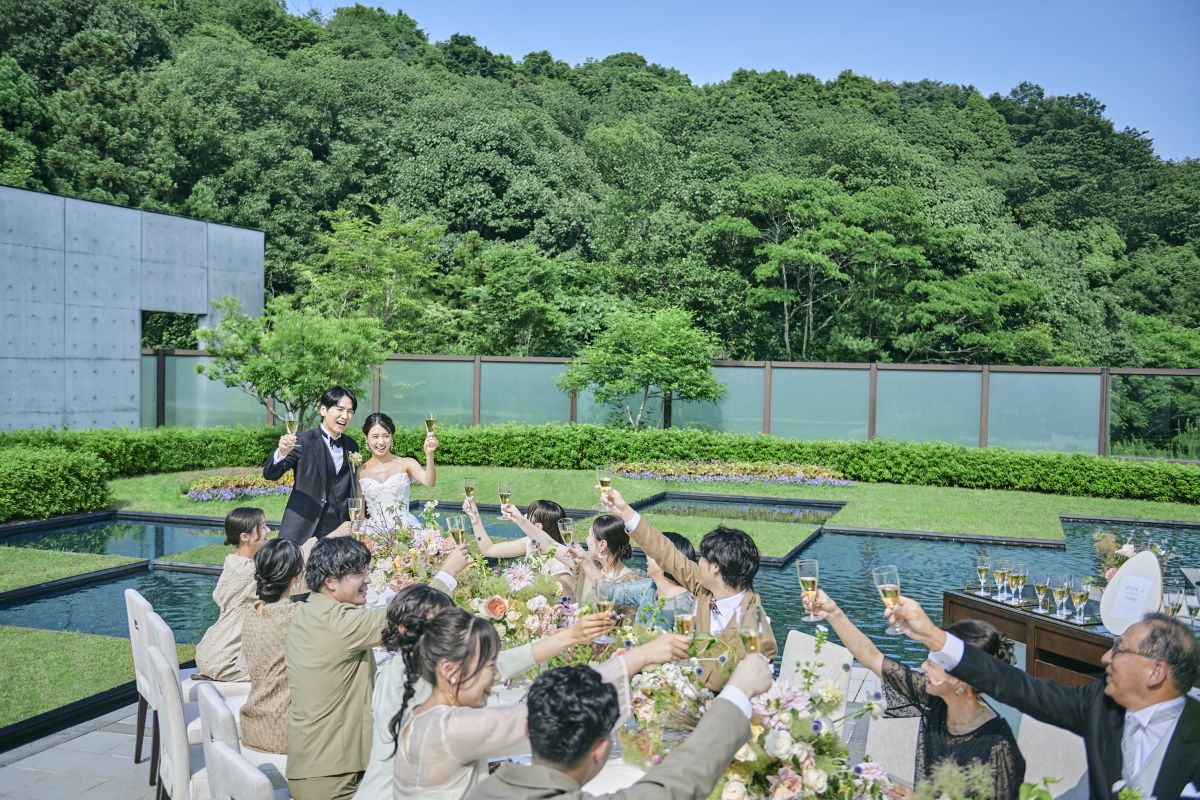 水×緑でデザインされた庭、広々としたテラスを備え、心地よいナチュラルウエディングが叶います。