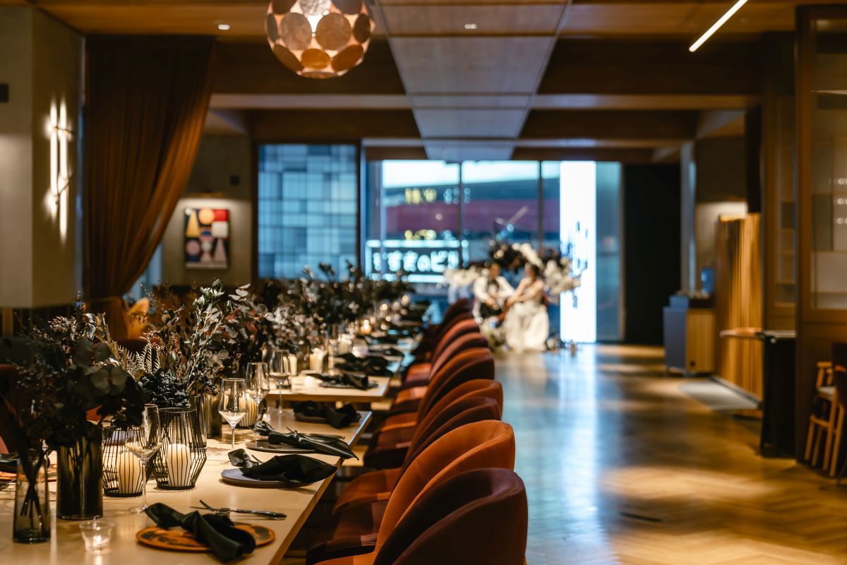 披露宴会場「BAR & GRILL Splish(収容人数6名〜100名)」は、スタイリッシュでおしゃれな内装。落ち着いた色合いを基調としていますが、大きな窓が設けられているため窮屈に感じることはありません。