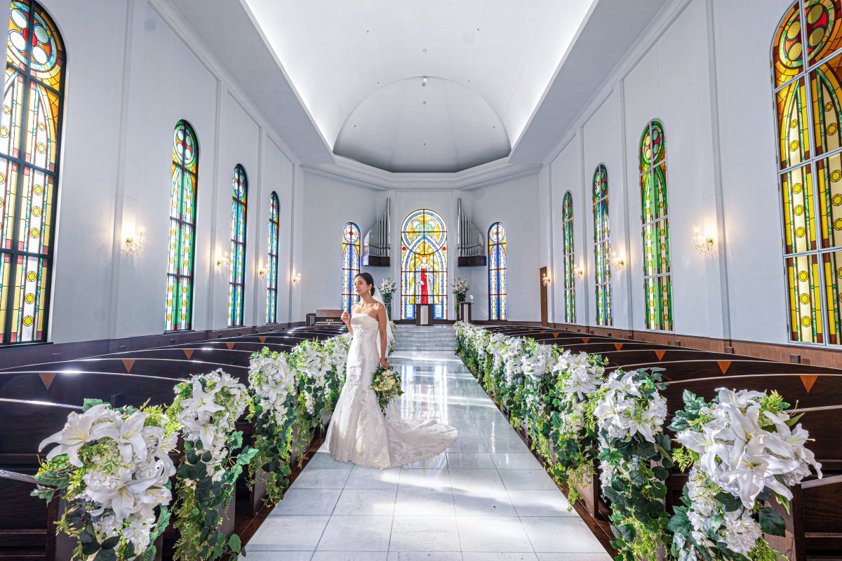 壁も天井もバージンロードもすべてが清らかな白一色で、カラフルなステンドグラスが空間を華やかに彩っています。