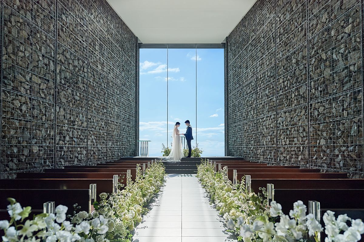 屋内挙式が行える「天空の教会」は、正面がガラス張りになった独立型チャペル。バージンロードの先にある祭壇の向こう側には、神戸の街並みと広大な空、青い海が広がっています。