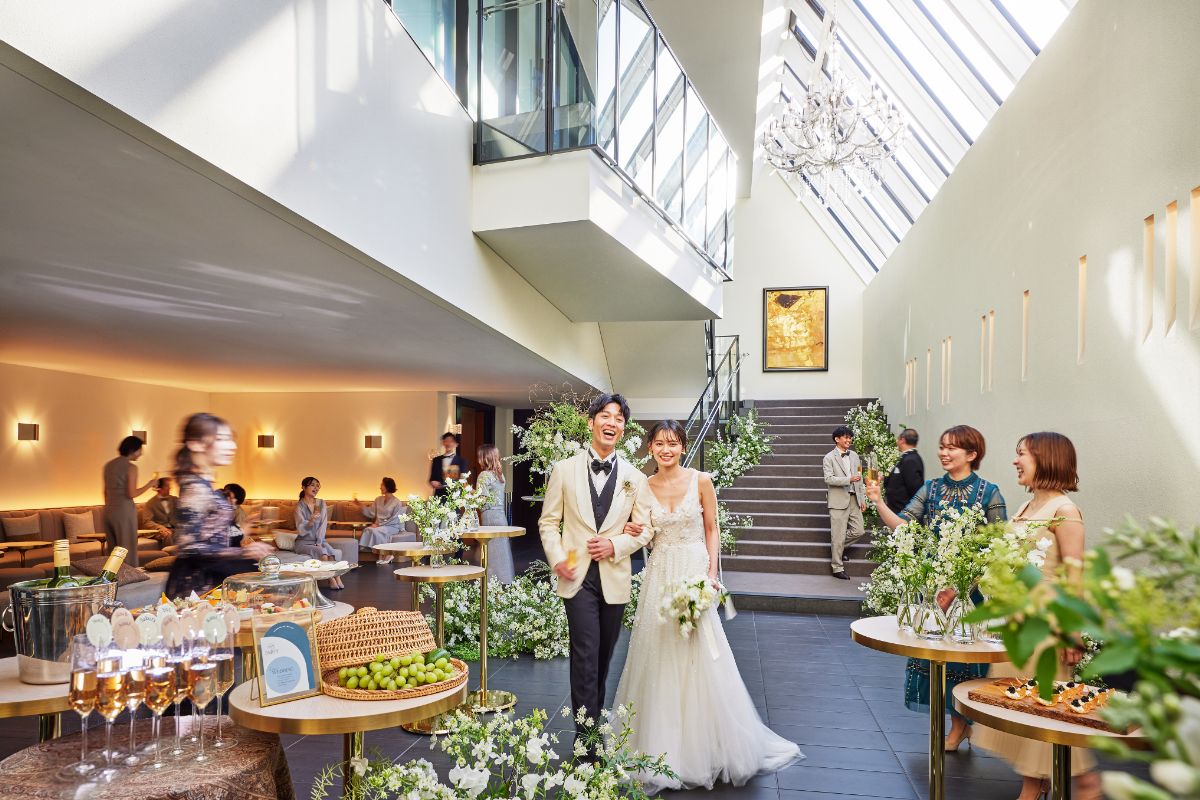 ソラ 神戸(SOLA KOBE)では、挙式と披露宴の間に歓談や写真撮影が楽しめるよう、“ウェルカムパーク”というスペースを設置。挙式後にドリンクや軽食を楽しみながら思い思いに過ごせるようになっています。