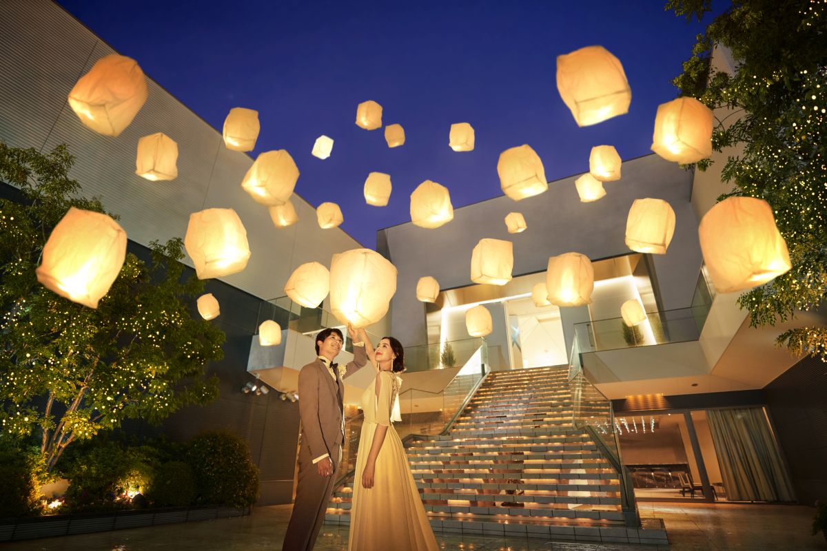 落ち着いた雰囲気のため、ドレスだけでなく和装とも好相性◎。自然光に包まれる中で行う披露宴も素敵ですが、テラスにキャンドルを灯して幻想的な雰囲気のナイトパーティーを行うのもおすすめです。