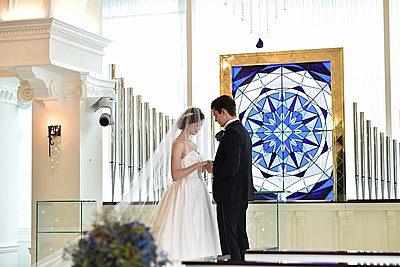 【荘厳でクラシカルなウェディング】ステンドグラスの輝きが美しいチャペルで大理石のバージロードを歩む神聖な結婚式を