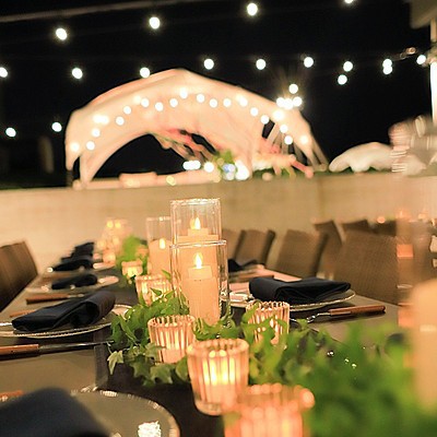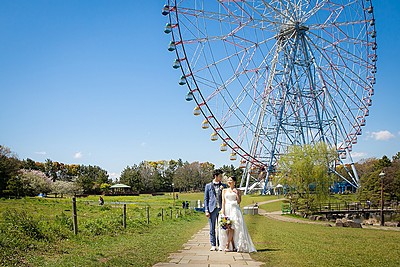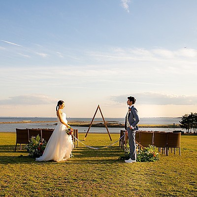青い空と緑の中で一層映える真っ白のドレス姿は、ひときわ眼を惹く最高のワンシーン。おふたりらしくこだわった特別な空間でたくさんの人から祝福してもらおう!