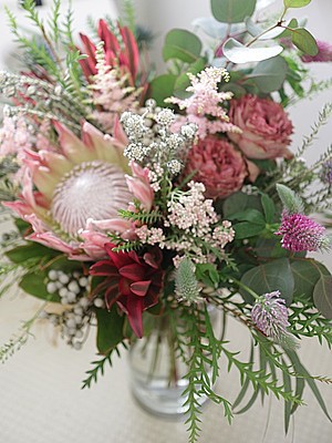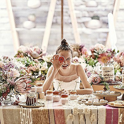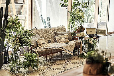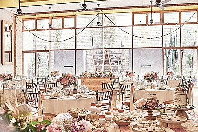自然素材の温もりを大切にした居心地のいいインテリア。明るい陽射しや緑溢れる植物たちが、オーガニックな雰囲気を醸し出す。カリフォルニアスタイルの会場でシンプルかつオシャレに魅せる2人のこだわりを会場いっぱいに表現して!