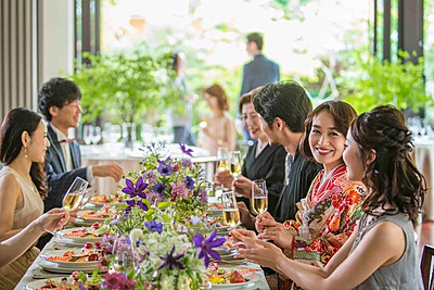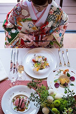 京都ならではの食を楽しむことができる会場ではシェフが2人に合わせたコース料理を提案してくれる!2人の想いやこだわりを反映して創られるお料理で楽しいパーティをワンランクアップさせておもてなしをしよう♪
