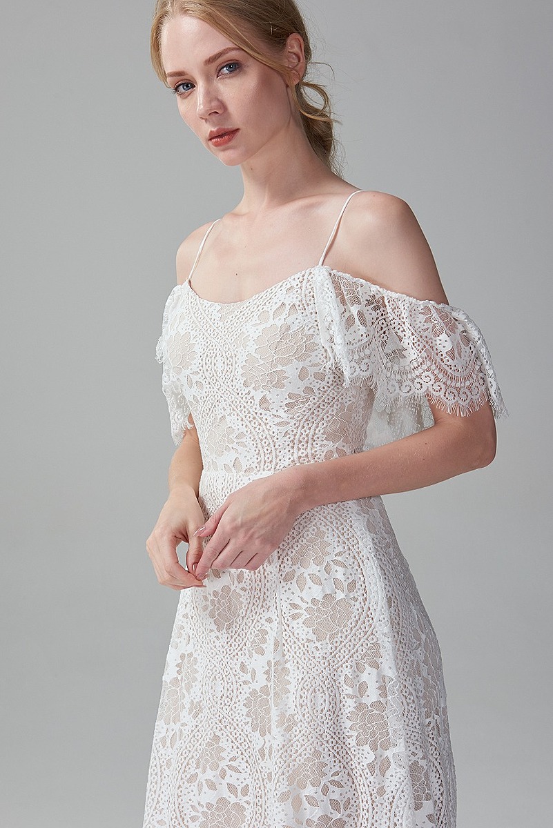アンティーク調レースが印象的なオフショルダードレスです。ショルダー部分は肩に上げてフレア袖としてもお使いいただけます。