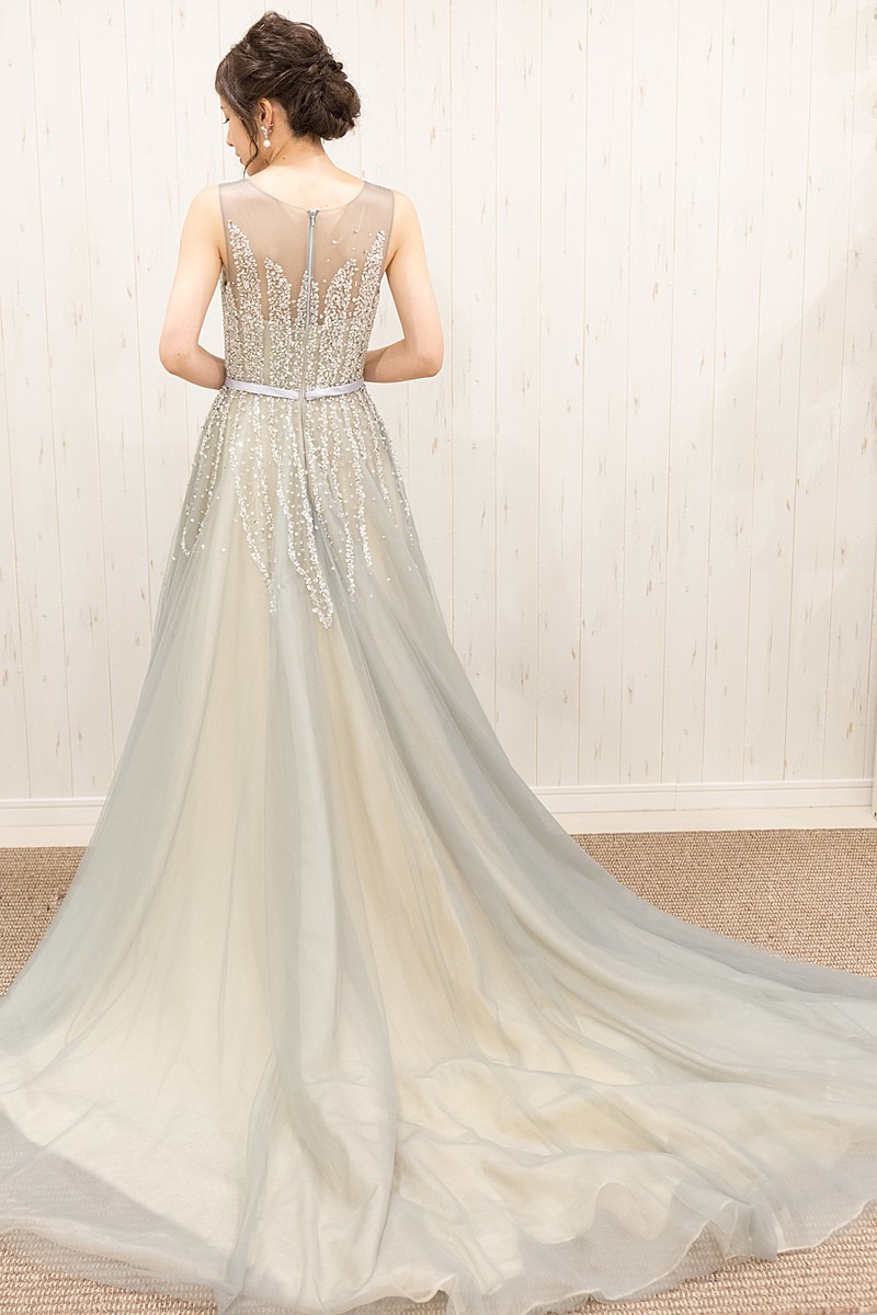 ビジューをふんだんに刺繍し、華やかながら落ち着いた色合いとすっきりしたシルエットで大人なドレスに仕上がりました。