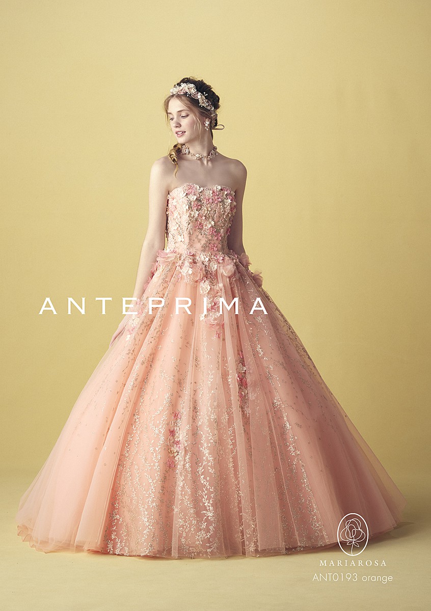 オレンジにピンクの花が施され華やか明るい印象に。 アンテプリマらしいキラキラはもちろん、チュールのスカートが可愛らしい1着。