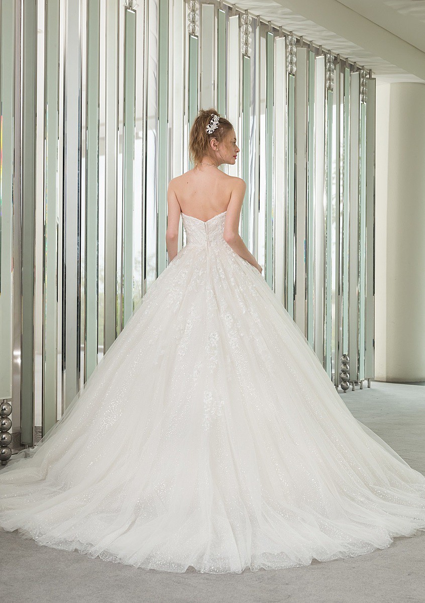 グリッターを散りばめた華やかなプリンセスドレス。大きなピンクリボンのバックスタイルも印象的です。