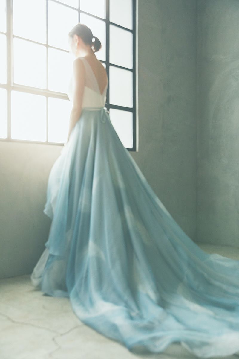 オリジナルで染めた透明感溢れるオーガンジーは、歩みを進めるたびにふんわりと舞う。