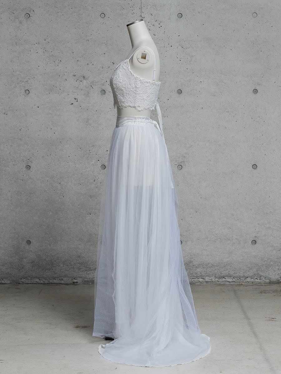 ショート丈のトップスは、シンプルでありながらも立体的なコードレースが存在感を与えてくれます。ご希望に合わせてシアー素材のボレロを重ねることで、より華やかな印象に。スカートは、シフォンの上にチュールを2枚重ねることで、広がりすぎず柔らかな印象のソフトAライン。*ボレロは追加15,000円+税でお選びいただけます。(画像3・4枚目)