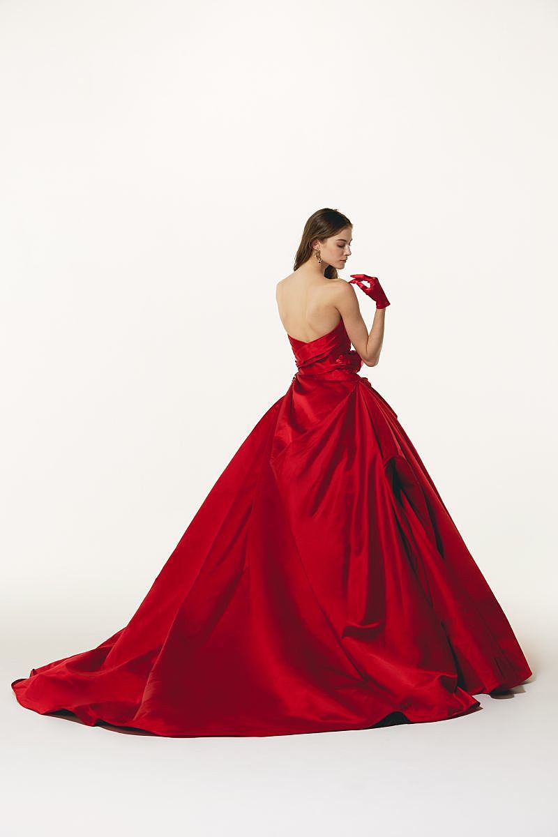 高級感のあるシルクと大胆なフォルムが魅力的なボリュームドレス。